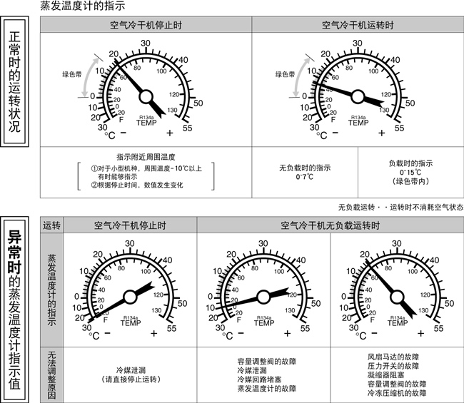 所謂的蒸發溫度計、是將冷媒壓力換算成冷媒溫度、作為蒸發溫度表示的計器。蒸發溫度計能夠確認冷干機是否正常工作。冷干機運轉時、請確認蒸發溫度計的表示是否在綠色帶范圍內。所謂蒸發溫度計,是將制冷劑壓力轉換成制冷劑溫度并代表蒸發溫度的儀表。蒸發溫度計可以確認冷干燥器是否工作正常。請確認冷干燥機運行時蒸發溫度計的指示在綠色范圍內。